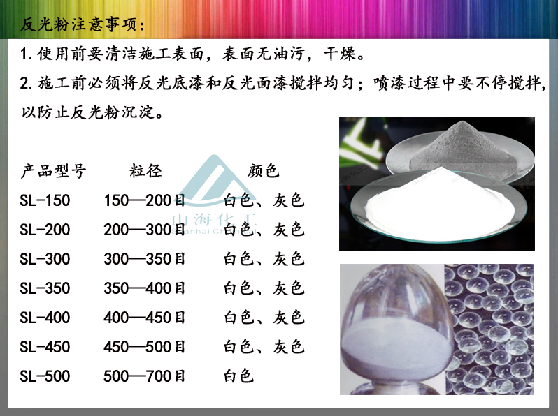 深圳山海化工颜料的反光粉按折射率可分为ND≥1.90、ND≥1.93、ND≥2.2三种,也可根据产品特殊性,提高或降低折射率,产品规格从100目-500目可分级提供。按颜色可分为白色和银灰色两种。所经销的高折射率反光粉用后半表面镀铝作为后向反射器,具有极强的逆向回归反射性能,能将85%的光线直接反射回光源处,回归反射所造成的反光亮度,可使驾驶人员和带光源的夜间作业人员在夜间或视野不佳的情况不清楚地看见行人和障碍目标,确保双方安全。